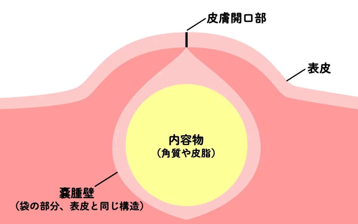 皮膚の内側に袋状のものができて、本当は皮膚から剥げ落ちるはずの垢だったり、皮脂だったりが袋の中に溜まってしまってできた腫瘍の総称なんす。