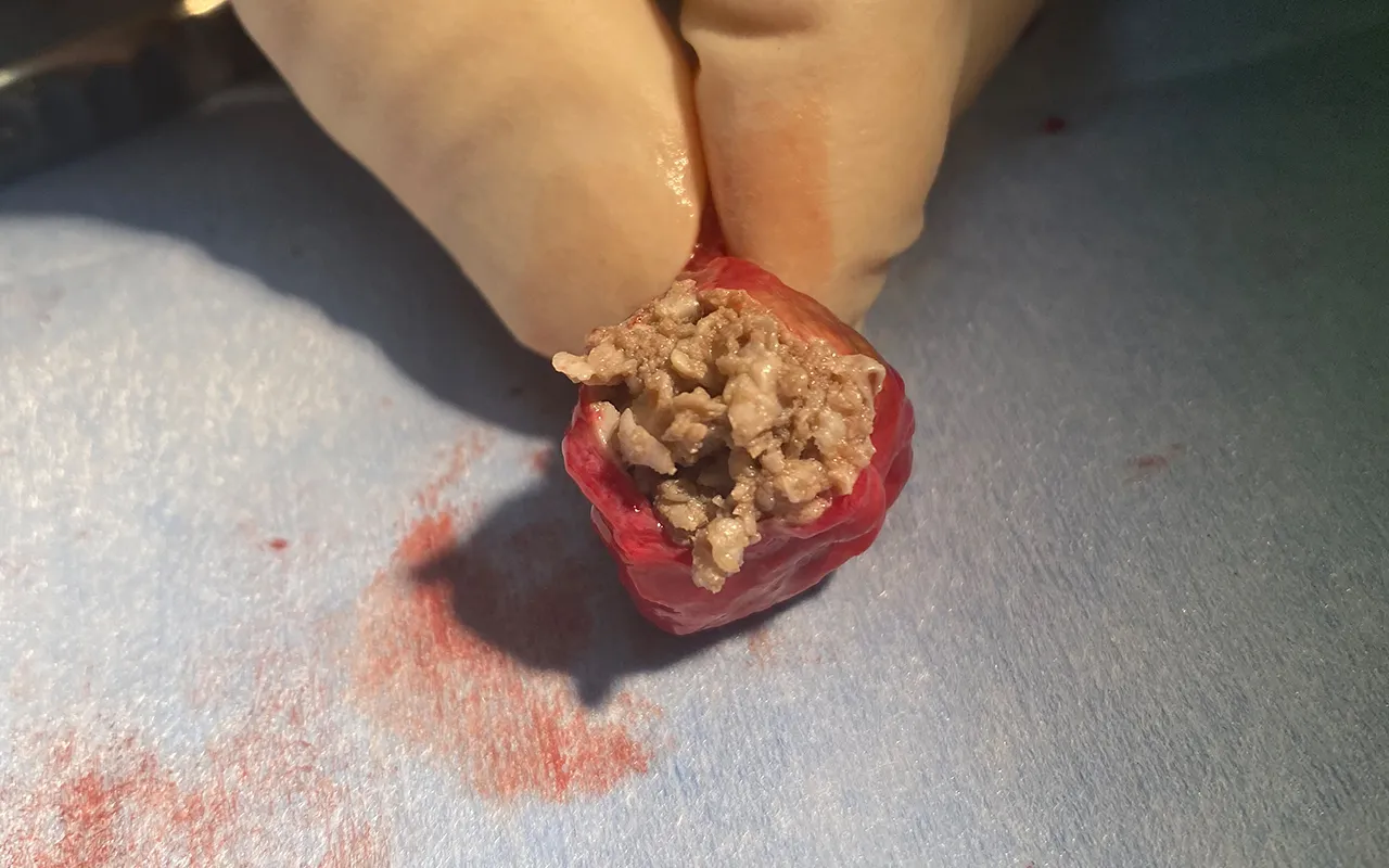 「結構前からできているアテロームなので、お尻の筋膜と癒着し始めていて剥がすのが大変です」